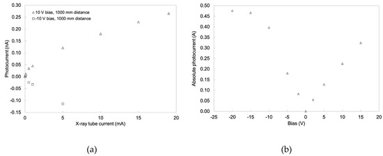 Figure 5a shows almost linear dependence of the photocurrent (10−10 A) on the X-ray tube current for both of the −10 V bias voltages at the fixed sample to X-ray source separation distance of 1000 mm; however, there was a significant time instability in photocurrents for the tube currents at 10 mA and above. We attribute this to imperfections of the contact electrodes and significant charging of the sample as a result of a strong radiation field at a given polarity. The relationship between the sample current and the bias voltage from −20 V to 20 V was determined by fixing the X-ray tube current to 5 mA and the sample-to-source distance to 1000 mm (Figure 5b). The IV curve is, in general, symmetrical over the entire voltage range.