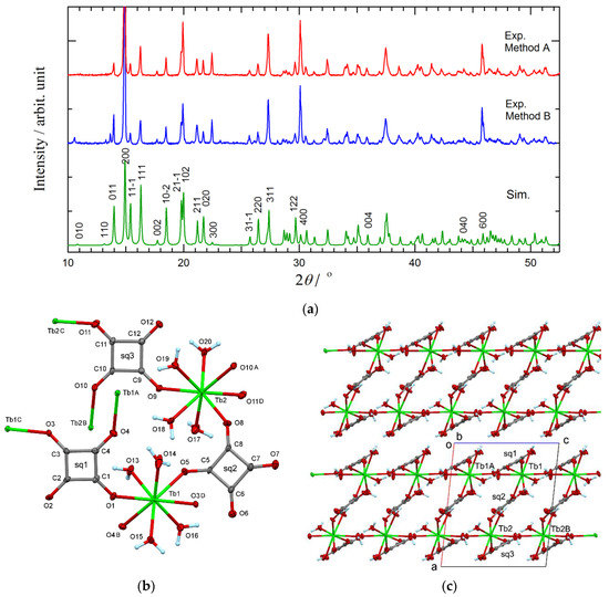 In the previous work [11,12,27,28], several pseudo-polymorphs are separated depending on the bridging mode of sq and the number of solvent (water) molecules ligating to metal ions and incorporated as a guest: [{Ln2(sq)3(H2O)4}n], [{Ln2(sq)3(H2O)11}n]· (H2O)2, [Ln(Hsq)(sq)(H2O)6], [Ln(Hsq)(sq)(H2O)6]·(H2O), [{Ln2(sq)2(ox)(H2O)4}n] (ox = oxalate), and Ln-sq. In the present study, such diversity was actually observed in the reactions from Tb and other Ln ions. However, we found that a dilute aqueous solution with a stoichiometric molar ratio according to Reaction Equation (1), namely TbCl3 (0.2 mmol) and H2sq (0.3 mmol) in water (10 mL), is preferable to afford Tb-sq (Method A). As Figure 1a shows, the purity as a bulk solid was confirmed by means of PXRD.