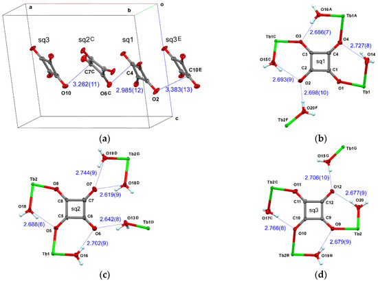The sq rings are stacked along the a axis (Figure 2a). The presence of π-π interaction has already been discussed in Eu-sq [11]. In addition to this, dipolar interaction between the polarized carbonyl groups (Scheme 1) should be pointed out, because the shortest interplane distances are found between the C and O atoms in a slipped π-π overlap. Furthermore, the dense hydrogen-bonding network also contributes to stabilizing the crystal. Relatively short O(w)•••O(sq) distances are depicted in Figure 2b-d. Seven-membered rings comprising O-C-C-O(sq)-Tb-O-H(w) atoms are an important motif. The oxygen atoms of H-donating water molecules are located nearly on the H-accepting sq molecular plane, indicating the sp2-hybridization of the sq oxygen atoms and the substantial O•••H interaction.
