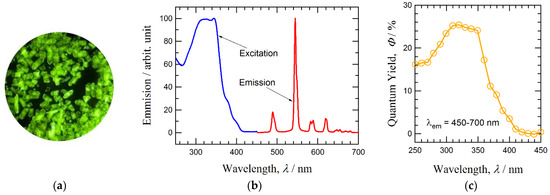 (a) A photo of a solid sample of Tb-sq under irradiation of UV light (375 nm). (b) Emission spectrum (λex = 320 nm) and excitation spectrum (λem = 450–700 nm) of polycrystalline Tb-sq recorded at room temperature. (c) Absolute photoluminescence quantum yield as a function of excitation wavelength.