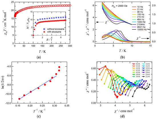 (a) Temperature dependence of χmT for Tb-sq, measured at 500 Oe. The sample was fixed with a small amount of eicosane for removing the field-align effect due to torqueing. Inset: M–H curves for Tb-sq, measured at 1.8 K with and without eicosane. (b) AC magnetic susceptibilities for Tb-sq at an applied DC field of 2000 Oe. Solid lines are drawn as a guide for the eye. (c) Arrhenius plot for Tb-sq with the data taken from (b). For a solid line, see the text. (d) Cole–Cole plots for Tb-sq. Solid lines are drawn as a guide for the eye.