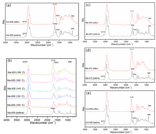 In both the slow low-temperature (e.g., Col-009, Figure 3a) and rapid high-temperature treatments (e.g., Ma-005, Figure 3b), the IR spectra of Colombia and Madagascar copal resins displayed a gradual shift in the strong absorption peak near 1697 cm−1 with increasing temperature or heating time, to ~1712 cm−1, while the 3078, 1642 and 888 cm−1 bands became weaker.