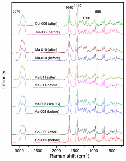 To summarize, the three heat–pressure treatments (e.g., Ma-011, Ma-010 and Col-006, Figure 4) changed Raman spectra more remarkably than did the two heat treatments (e.g., Col-009 and Ma-005, Figure 4) applied to Colombia and Madagascar copal resins. Reductions in H1640/H1440 ratios during heat treatments were generally in the range of 7–14%, and those of heat–pressure treatments were 14–42% (Table 4). The decrease in H1640/H1440 ratio can be used as a quantitative indicator of the modification effect of treatment.