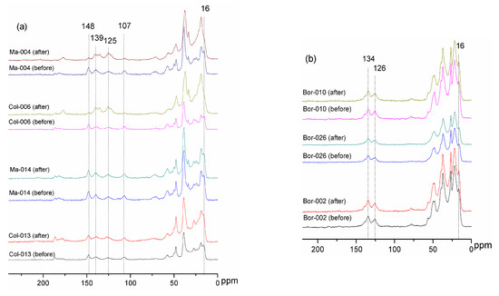 Comparison of the NMR spectra of ambers and copal resins of different origins indicates that the resonance peak at 14–18 ppm in the saturated region, due to C–C single bonds (primary carbon) of adeps-methyl groups [3,25], appears only with copal resins. This is assumed to be an NMR typical peak of immature resins, which may shift to a higher field with increasing age until the C–C bond is broken. For example, the resonance near 16 ppm disappeared after multi-stage heat–pressure treatment (e.g., Col-006 and Ma-004, Figure 5a).