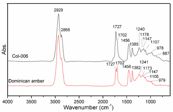IR spectra of Dominican amber and sample Col-006 after multi-stage heat–pressure treatment.