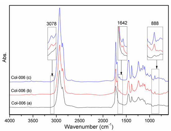 IR spectra of sample Col-006 after multi-stage heat–pressure treatment at different depths from the surface. With increasing sampling depth (a–c), the bands at 3078, 1642 and 888 cm−1 began to reappear with increasing intensity.