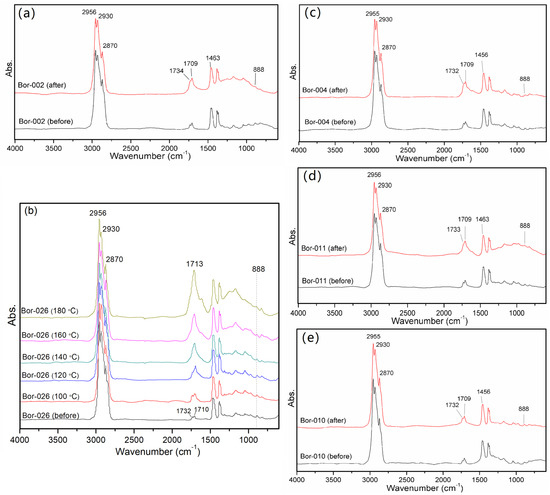 After other three heat–pressure experiments (e.g., Bor-004, 011, 010, Figure 8c–e), spectral changes were similar to those recorded in the two heat treatments, with the ratios H1710/H1464 and H1710/H2957 increasing to 0.50–0.73 and 0.14–0.20, respectively.