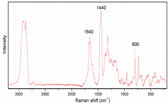 Raman spectra of copal resins from Borneo differed from those of the Colombia and Madagascar copal resins with a lack of a peak at 1200 cm−1, usually assigned to δ(CCH) modes of terpenoids or δ(C–O) modes. The extra feature at 800 cm−1 occurs only in the spectra of Borneo copal resins (Figure 9) and was attributed to aromatic hydrocarbon deformations in previous studies, explaining the characteristic strong luminescence of these resins [22,23,30]. Raman spectral profiles are also related to the botanical sources, as Borneo resins are from the Dipterocarpaceae family and Colombia and Madagascar resins from Hymenaea species.