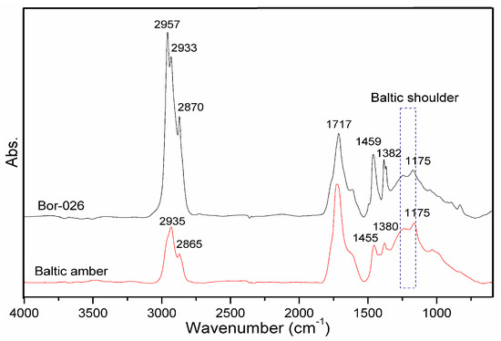 When the Borneo copal resin samples were heated to 180 °C in the rapid high-temperature method, the double peaks of sample Bor-026 at 1733 and 1710 cm−1 merged into a strong absorption band at 1717 cm−1, and the peak near 1165 cm−1 was enhanced and shifted to a higher wavenumber, forming a broad absorption shoulder similar to the Baltic shoulder at 1250–1175 cm−1, which means samples could be confused with Baltic amber (Figure 10). The main difference between the two IR spectra is the absence of a peak near 2957 cm−1 assigned to C–H stretching in the IR spectra of Baltic ambers.