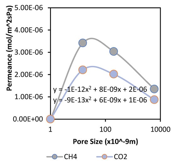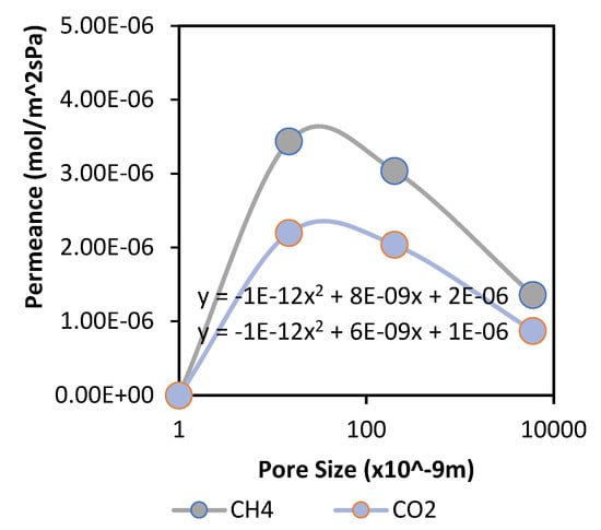 A quadratic curve is noticed in Figure 2 and Figure 3, which is in the form y = a + bx + cx2 and can be linked to the parallel flow model described by De Meis [], which confirms the interplay of viscous and Knudsen diffusion within these membranes. It appears that Knudsen diffusion occurs on the top membrane layer (having a lower average/mean pore size), while a combination of laminar flow and Knudsen diffusion takes place in other layers. This study, therefore, confirms that Knudsen diffusion can occur in the microporous range due to more molecule/pore wall collision depending on the type of gases used. In this case, the membrane selectivity values were in the ideal Knudsen selectivity range for CO2 and CH4 gases due to the differences in the molecular weight of the gases. However, the presence of viscous flow limits the separation properties initiated by Knudsen diffusion. Thus, for effective separation, we require the introduction of a dominant flow mechanism, such as surface diffusion, to cause significant interaction of the target gas molecules with the pore surfaces and further improve the membrane performance.