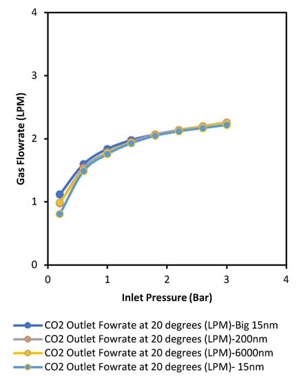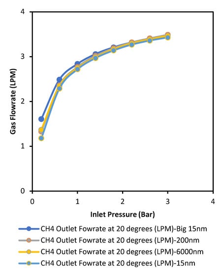 Pressure is an important engineering quantity that affects many aspects of fluid mechanics. It has been identified that pressure significantly affects CH4 diffusion at lower pressure rather than high pressure []. This is confirmed in Section 4.3; however, the authors did not relate this to the CO2 diffusion rate and other system factors, which are crucial to a biogas separation unit. Hence, these experiments used up to eight isobars to investigate the effect of the coupling of pressure and other parameters on the separation process.