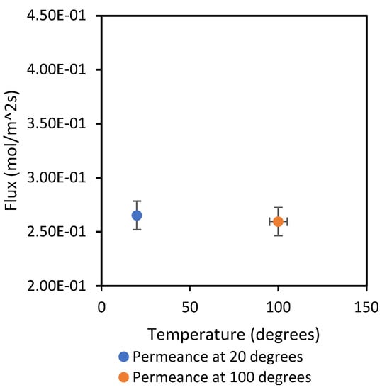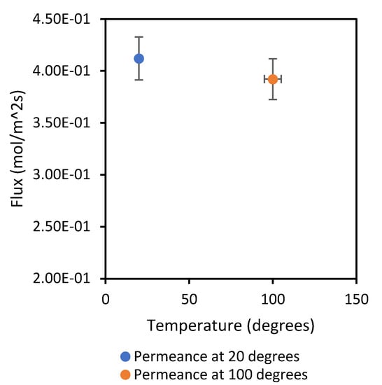 The results in Figure 6 and Figure 7 show an overall increase in gas flowrate as temperature increases from 20 °C to 100 °C. This can be explained by the influence of temperature on the kinetic energy of gas molecules, which makes the molecules move faster with an increase in temperature. On the other hand, the flow mechanism is confirmed. CH4 flux was reduced from 0.4120 to 0.3922 mol/m2s when the temperature was increased from 20 to 100 °C. Likewise, CO2 sees a decline in flux from 0.2653 to 0.2595 mol/m2s with temperature increase; these types of changes in flux are typical of the Knudsen regime. Furthermore, to confirm this trend, both gases were analysed at 400 °C, and the flux for CH4 and CO2 was 0.2181 and 0.1219, respectively. From the Knudsen equation, it is known that the permeating flux decreases as temperature increases in this regime, usually in mesoporous membranes, because the temperature increase causes the decrease in surface concentration to overcome the increased effect on diffusivity.