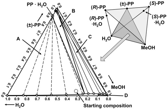 Solubility diagram of racemic phencyphos (PP), water and MeOH at 20 °C in weight fractions which is the middle section of the quaternary phase diagram depicted in the top-right corner. Region A: Solid PP·H2O (conglomerate) and solution. Note that the tie-lines depicted in this region radiate out of this plane towards the edges of the quaternary phase diagram where (R)-PP·H2O and (S)-PP·H2O are located, Region B: mixtures of anhydrous PP, PP·H2O and solution. Region C: Solid anhydrous PP (racemic compound) and solution. Region D: undersaturated solution. Open dots are measured points.