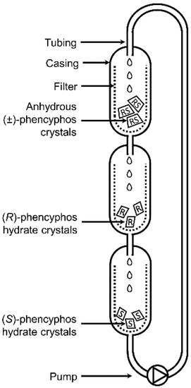 The experimental setup depicted in Figure 3 was constructed in which the “U” shaped lines represent Soxhlet filters, which are placed inside a plastic casing. The top filter was charged with a suspension of 10 g of anhydrous (±)-phencyphos in 30% wt. H2O in MeOH (this starting composition has been marked in Figure 2). The middle filter was charged with ~200 mg enantiopure (R)-phencyphos hydrate seeds and the bottom filter with ~200 mg enantiopure (S)-phencyphos hydrate seeds. The suspension in the top filter is slightly supersaturated in phencyphos hydrate and, after passing through the top filter, the clear solution passes on to the middle filter by gravity. There, the supersaturated (R)-enantiomer crystallizes on the seeds of the (R)-phencyphos hydrate. The solution which is supersaturated in the (S)-enantiomer passes though the filter and crystallizes on the seeds of (S)-phencyphos hydrate in the bottom compartment. The filtrate from the bottom filter is then pumped to the top filter dissolving some of the anhydrous phencyphos racemate for another run.