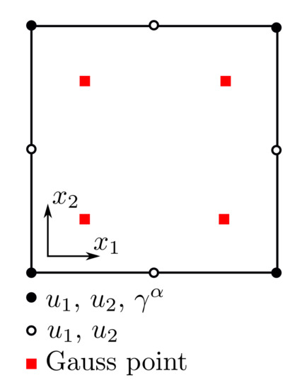 Several finite element types can be used to approximate these fields. In this work, an element type employing eight-noded (quadratic) interpolation of , four-noded (linear) interpolation of and Gauss integration is adopted (Figure 1). Based on Kuroda [11], this element type is well suited to study localization problems. Within each element, displacements and plastic scalar variables can be approximated based on the associated nodal values as follows: