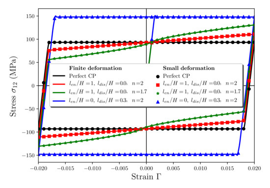 This parameter can also be set to zero in order to obtain progressive activation of the higher-order dissipative effects, as with the energetic ones involved in the previous subsection. In this case, a nonzero higher-order hardening modulus is necessary to activate such effects according to (34). Using and }, the obtained results (not presented in the paper) are qualitatively quite similar to those obtained in the above subsection.