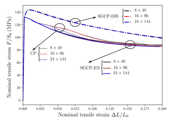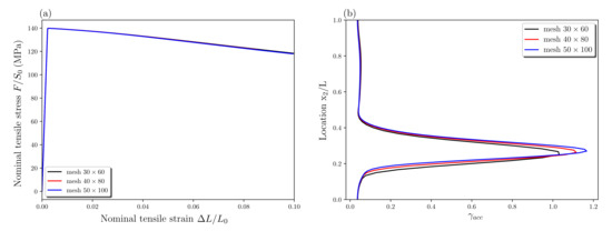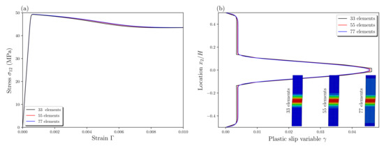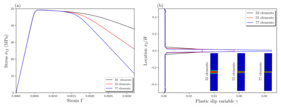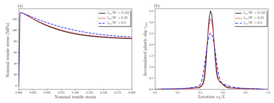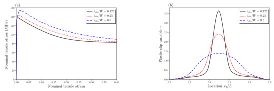 Figure 15 presents the nominal tensile stress–strain curves and the plastic slip variable distributions along the plate length direction for different energetic length scales. Although no change in the initial yield is observed, the stress level after yielding increases with increasing due to strain gradient hardening effects (Figure 15a). In addition, larger leads to a larger final localization band with lower peak value of plastic slip in this band (Figure 15b). This is in accordance with several investigations based on nonlocal approaches [26,29,53,58,59]. The energetic length scale behaves as a “localization limiter” and governs the width of localization bands.