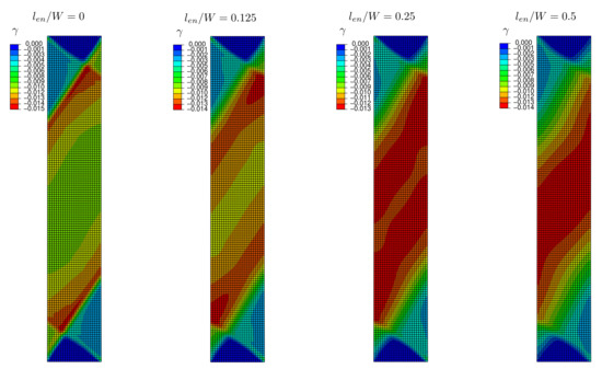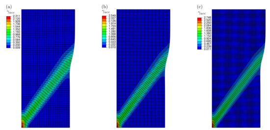 To investigate the influence of the higher-order energetic effects on the present localization behavior, different values of were tested. Figure 14 presents the associated results in terms of plastic slip contours in the studied plate at straining , which corresponds to the emergence of kink bands. The width of the obtained bands as well as the distance between them are functions of . By increasing this parameter, larger and closer kink bands are obtained. For sufficiently large , a single kink band located at the center of the considered plate is formed.