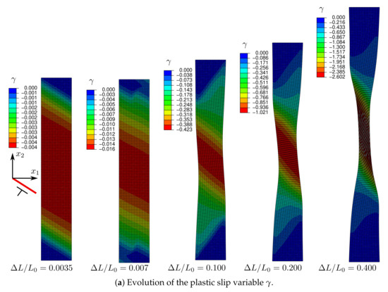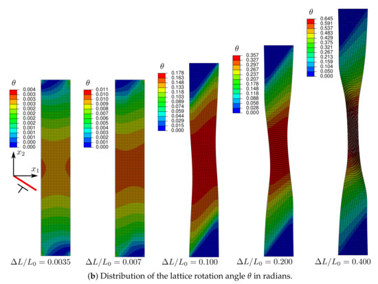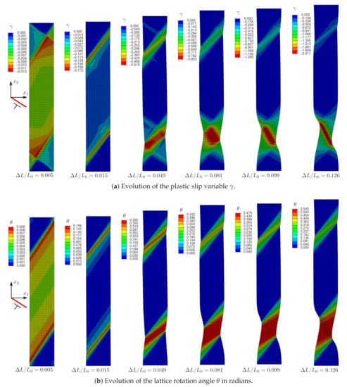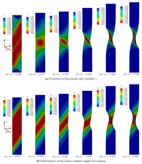 A less-pronounced kink region appears at the plate center and interacts with the initial slip region, as can be shown by analyzing the lattice rotation distributions in the plate (Figure 16b). The width of both these regions continues to reduce with increasing until the final necking of the plate. The final localization band is oriented to an angle close to that of the slip direction. Compared to those obtained in the previous subsections, this band is much more diffuse. Using higher-order dissipative effects with nonzero , slip localization seems to outweigh kinking, although the latter phenomenon is not completely removed.