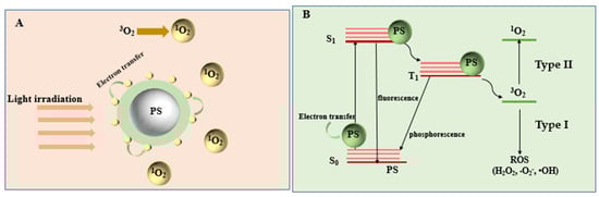 Diagram of the PDT mechanism at the moment when energy is transferred from photosensitizers (PS) to activate the photosensitizers. (A) The generation of 1O2 through the electron transfer process. (B) The process of energy transfer and the PDT mechanism.