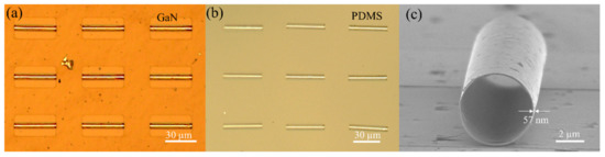To obtain a flexible platform, it was decided to lift the microtubes from the native GaN-doped layer to a foreign flexible substrate. A 300-µm-thin PDMS film was first deposited on a glass substrate via spin coating and was then baked at 90 °C for 10 min. The GaN wafer was put on the thin PDMS film with the sapphire substrate facing up. The GaN microcavity adhered to the soft PDMS and the microtube was transferred to the PDMS by mechanically lifting it off the wafer. Finally, another thin PDMS film of about 50 μm in thickness was spun on the GaN microtubes for protection and mechanical support purposes. Optical microscopy images of the GaN microtubes on sapphire and PDMS substrates are shown in Figure 1a,b, respectively, which indicates that the GaN microtubes were successfully peeled off of the n-GaN layer and sapphire. Figure 1c shows a side view of a single 5-μm diameter microtube with a good morphology and smooth surface. The wall thickness of the microtube was about 57 nm.