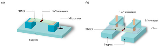 In recent years, electronic/photonic components integrated on stretchable substrates have created enormous research interests due to their wide and novel applications in soft robots [1,2], bioelectric medicine [3,4], human augmentation [5], displays [6,7], energy storage devices [8,9], and wearable sensing [10,11,12]. Among them, micro/nano lasers embedded on a stretchable substrate have been widely studied as random laser sources [13,14,15,16], strain sensors [17,18], and for other applications, because they can avoid rigid material substrates and render their applications in a deformable state or as soft systems. Strain sensors with a high detection sensitivity, which are used to monitor small-scale deformations, call for a small device footprint, high-power consumption, and narrow linewidth. Meanwhile, whispering gallery mode (WGM) lasers, known for their small mode volume and high quality factors (Q), are excellent optical cavities for low threshold micro/nano laser with narrow linewidths [19]. Due to the excellent optoelectronic properties, such as a wide wavelength, strong light−matter interaction, stable physical and chemical properties, gallium nitride (GaN)-based materials have been used as a gain material for WGM resonators [20]. Thanks to the development of electrochemical etching [21] and photoelectrochemical etching [22], ultra-thin GaN film has been demonstrated using chemical exfoliation in previous works [23,24,25], which makes gallium nitride microtube lasers possible. Previous studies of WGM lasers employed microdisks or microfiber embedded in a flexible substrate [26,27,28,29,30] as strain sensors. For example, a GaN microdisk laser with a diameter of 1.2 μm embedded in a polydimethylsiloxane (PDMS) substrate as a strain sensor has a blue-shift per stretching unit of about 4.0 nm [29]. In addition, by applying different forms of strain to a polymer microfiber in the flexible PDMS substrate, bi-directional tuning of the wavelength was achieved [27]. However, only a relatively low strain response was achieved due to the small refractive index variations of the flexible substrate materials. Meanwhile, the low quality factor of GaN-based microdisks usually leads to a low limit of detection (LOD). In this study, we fabricated a three-dimensional (3D) tubular WGM microcavity and transferred it onto a flexible transparent PDMS substrate. The ultra-thin well of the tubular WGM microcavity (less than 60 nm) allows it to be easily deformed under applied force and is sensitive to three-dimensional strain. A low threshold excitation energy density was achieved while high quality factors were maintained due to the small mode volume and the large refractive index contrast between the GaN material and the PDMS substrate [31]. The unique geometry of the tubular structure has a 3D mode confinement and trimmed resonant modes, making it a strong candidate for 3D microscale strain gauges, photonic integrated circuits, flexible laser displays, or other sensors.