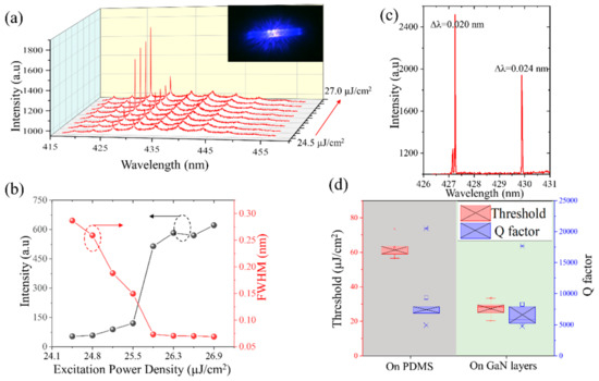 Figure 3a shows the PL spectra of a microtube in PDMS, which was excited from 24.5 μJ/cm2 to 27.0 μJ/cm2. All spectra correspond to the TM polarization mode due to the fact that the TE mode was not sustainable for such thin-walled microcavities [32]. The optical mode separation (free spectral range (FSR)) was measured at around 4.0 nm when was 430 nm, which matched the calculations using the periodic boundary condition . In this equation, R represents the radius of the microtubule, λ represents the wavelength of the laser, represents the effective refractive index of the microtube material, and m represents the azimuthal mode number. As shown in Figure 3a we also found a series of resonant peaks at 419.03, 422.95, 426.79, 430.82, 435.07, 439.38 nm, etc., which correspond to successive azimuthal modes. As the pump energy increased, certain resonance modes, such at 426.79 nm and 430.82 nm, changed from spontaneous emission to stimulated emission. Figure 3b shows the PL intensity and full width at half maximum (FWHM) versus pump energy density for the 426.79-nm peak of the microtube in the PDMS substrate. When the threshold was reached, the linewidth of the resonance peak decreased from 0.29 nm to 0.07 nm, confirming the occurrence of stimulated emission. Figure 3c shows the PL spectrum of another microtube with a narrow FWHM of about 19.8 pm and 24.1 pm at 427.25 nm and 429.89 nm, and the corresponding Q factors are 21,578 and 17,837, respectively. Such numbers were considered large enough compared to other Q values of tubular microcavity that were reported previously [34,35,36]. Figure 3d shows a box-plot showing a comparison of the threshold and the Q factor between the PDMS and GaN substrates. To eliminate the individual difference, five microtubes were measured. The average threshold was reduced from 62.86 μJ/cm2 to 27.34 μJ/cm2 while the Q value fluctuated in a relatively large range, resulting in no significant difference before and after the transfer.