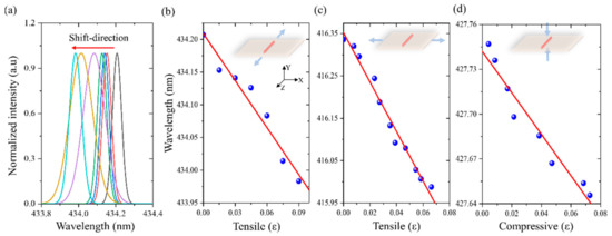 (a) PL spectra in the Z direction measured under different stretching conditions from 0 to 0.09 ε. (b–d) show the measured lasing wavelength changing under various tensile conditions in the Z and X directions and compressive conditions in the Y direction, respectively. The insets in (b–d) show the direction of applied force.