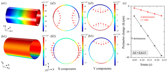 Figure 6(a1) shows the 3D deformation distribution under 0.05 ε tensile strain from the Z direction as if the microtube was stretched from the right end while fixing the left end. The cross-sectional deformation magnitude of the X and Y components are shown in Figure 6(a2,a3), respectively. The direction and the length of the arrow represent the direction and the magnitude of the deformation. The calculations show that the perimeter length (L) of the microtube decreases as the tensile strain increases. The changed length (∆L) can be calculated by: where ∆λ represents the blue-shift. Figure 6c shows the numerical simulation results of the microtubule circumference variations with applied strain. The ∆L in the Z direction was calculated and the corresponding to the per stretching unit was 0.09 nm. In the same way, we could simulate the deformation distribution under 0.05 ε tensile strain, as if the microtube was pressed from the top while fixing the bottom (Figure 6(b1)). The cross-sectional deformation magnitude of the X component and Y component are show in Figure 6(b2,b3), respectively. Due to the rotational symmetry in the X–Y plane blue-shift per stretching unit by strain in the both X and Y direction show the same value of 4.60 nm/ε while the value in the Z direction is 0.09 nm/ε. Blue-shift per stretching unit in the X, Y, and Z directions were measured as 5.83, 1.38 and 2.39 nm/ε, respectively. The discrepancy between the calculations and measurements can be attributed to the refractive index change of the PDMS alone. The variation introduced by the PDMS could be estimated as 2.23 nm/ε ((5.83 nm/ε − 1.38 nm/ε)/2), meaning that when PDMS stretched one unit of strain, the change in the refractive index will lead to a blue-shift of 2.23 nm/ε. The measured blue-shift with an applied force in the Z direction should be attributed to both the index change of the PDMS and the deformation of the microtube. The total per stretching unit in the simulation was about 2.32 nm/ε (2.23 nm/ε from PDMS and 0.09 nm/ε from microtube), which was very close to the experimental result of 2.39 nm/ε. Presently, we proved that the stress-induced blue-shift was caused by deformation of both the microtube and the PDMS. This helps us to better design and characterize a strain sensor with an ultra-thin microtube cavity in a flexible substrate.