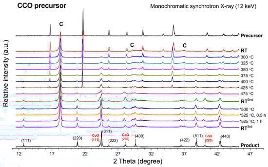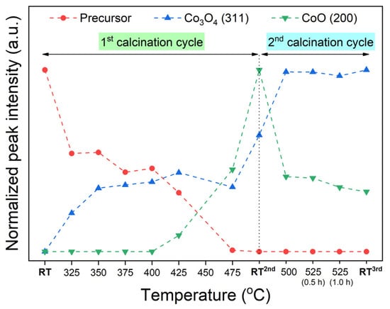For a better data visualization, the progress of phase transition at a specific temperature was calculated concerning the normalized peak area from the diffractogram. Specifically, the integrated area of the main reflection peak belonging to the precursor (21.7°), the CoCo2O4 spinel (24.5°), and the CoO phases (28.1°) are considered. Note that the maximum intensity for each phase is considered as the reference point. Through this, the peak intensity profiles, as shown in Figure 2, indicate the evolution of crystalline oxide phases at specific temperatures.
