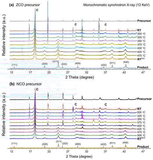 In-situ XRD profile represents phase transformation of the (a) ZCO precursor and (b) NCO precursor upon an elevating calcination temperature. (C = graphite dome).