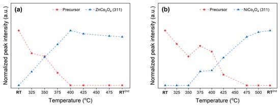 Profiles of normalized XRD intensities represent the progress of phase transformation of (a) ZCO and (b) NCO precursors, deriving from in-situ XRD data in Figure 3a,b, respectively.