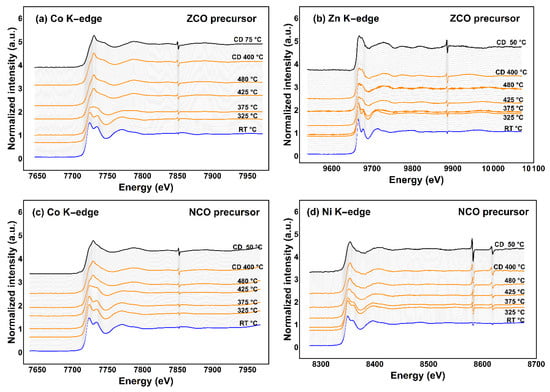 TRXAS K-edge spectra of metal species in two different spinel precursors; (a) cobalt and (b) zinc in the ZCO precursor; (c) cobalt, and (d) nickel in the NCO precursor.
