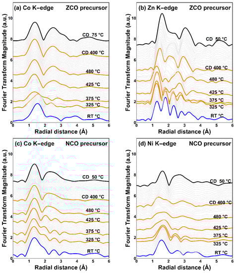 As viewed from Figure 6a,c (from the bottom to the top), the development of the cobalt local structure can be roughly divided into two stages: (i) the establishment of the cobaltite spinel oxide structure during temperature ramping up and (ii) the maintenance of the established structure during the cooling down step. At the first stage, the local structure of cobalt is dramatically changed by the elevating temperature up to 480 °C. Afterward, that developed structure remains unchanged during the cooldown, suggesting a settlement of the cobaltite spinel framework. The first coordination shell of cobalt (after cooling down) is approximated to be around 1.35–1.36 Å for both the obtained products from thermal decomposition of the ZCO and NCO precursors. These estimated bond lengths are close to the reported Co-O bond length in CoCo2O4 (~1.5 Å) []. However, by using the same analogy as cobalt, different behaviors of the metal substituent can be found by focusing on the cooling down period. It is found that, after the settlement of the cobaltite spinel framework, the local environment of the substituents is drastically changed during the cooling down period. Therefore, the result indicates the repositioning of metal cationic substituents to approach the most stable occupation site during the cooling down step.
