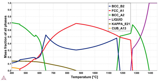 The Thermo-Calc calculations (Figure 1) showed that the solidification will contain ferrite and austenite. The calculated liquidus and solidus temperatures are 1392 and 1258 °C, respectively. The δ-ferrite (BCC_A2) begins to solidify first at 1392 °C, followed by austenite (FCC_A1) at 1272 °C. The ferrite begins to transform into the ordered B2 phase (BCC_B2) at 1181 °C, the equilibrium transformation is complete at 1158 °C, and the ferrite (BCC_A2) reappears at 646 °C, with the lower temperatures then favouring lower B2 contents. The austenite content also starts to decrease with decreasing temperatures and is close to zero at 458 °C. However, the austenite content is highest at 864 °C, as its content increases from its first appearance during solidification. The decrease in austenite at 864 °C is due to the precipitation of kappa carbides (KAPPA_E21), whose content increases with decreasing temperature.