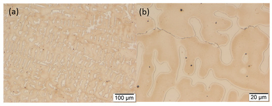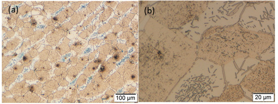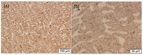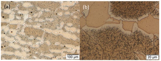 Optical microscopy of the forged complex microstructure, etched with 10% nital, ferrite––white, and austenite and carbides––darker brown; (a) the microstructure retained the dendritic morphology, (b) some enhanced grain boundaries––possible precipitation.