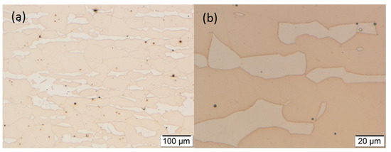 Optical microscopy of the as cast duplex microstructure, etched with 10% nital, ferrite––white, and austenite––brown; (a) the microstructure is elongated along the hot forging direction, but there is no visible deformation remaining in the crystal grains, indicating a full recrystallization, (b) magnified detail, there is no precipitation on the grain boundaries.