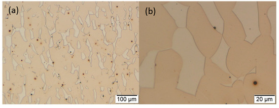 Optical microscopy of the sample that was isothermally annealed at 450 °C, etched with 10% nital, (a) ferrite––white, and austenite––brown, (b) magnified detail, there is possible precipitation on the grain boundaries.