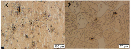 Optical microscopy of the sample that was isothermally annealed at 850 °C, etched with 10% nital, (a) ferrite––white with visible carbide precipitates, and austenite––brown with visible precipitation, (b) magnified detail, there is a strong precipitation in austenite, where the precipitates seem to have formed along the twin boundaries, the ferrite grains contain a few coarse carbides.
