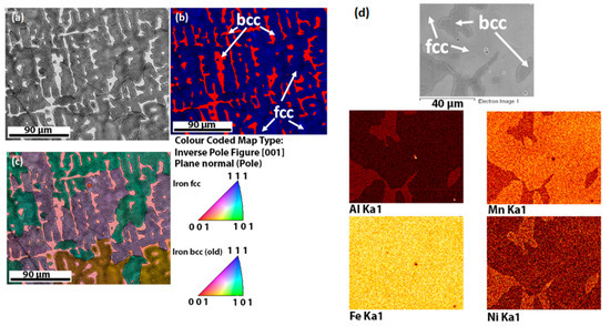 Microstructure of the as-cast sample, (a) BE (Backscattered electron) image, (b) EBSD (Electron Backscatter Diffraction) phase analysis (c) IPF-Z (Inverse Pole Figure–Z axis) analysis (d) EDS (Energy-dispersive X-ray spectroscopy) elemental mapping of Al, Mn, Fe, and Ni.