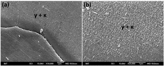 Electron backscatter diffraction phase analysis confirmed that the as-cast sample consisted of FCC––austenite, with BCC––ferrite islands. The results are shown in Figure 11. No precipitate phases are visible in the microstructure at this scale. Figure 11c,d shows the elemental distribution maps obtained by EDS analysis of Al and Mn. The ferrite phase shows increased Al content and the austenite fraction shows increased Mn content, consistent with the formation of α and γ phases. No precipitates are visible in the EDS mapping, but higher magnification SE images shows a substructure in the austenite phase (Figure 12). The austenite substructure is formed by a spinodal transformation γ → κ + γ0 leading to nano-sized kappa carbides [18]. The ferrite–austenite grain boundary had a more pronounced etching effect.