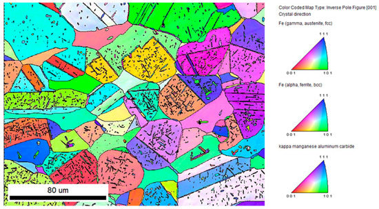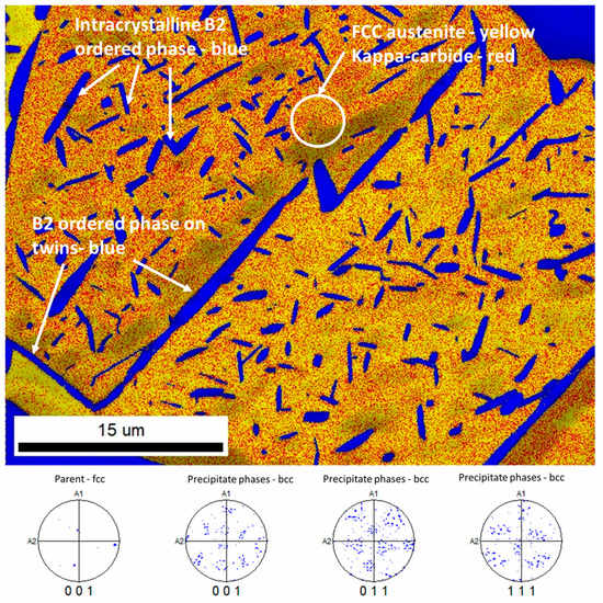 At 750 °C, austenite and kappa-carbide phase precipitate in ferrite, similar to the sample annealed at 850 °C. However, the formation of kappa carbides in austenite is indicated by EBSD phase analysis, as shown in Figure 14, sample annealed at 850 °C. At 750 and especially 850 °C B2 ordered phase precipitates occur along the grain boundaries, on the austenite twins and within the austenite phase. The B2 ordered phase can be identified by its BCC crystal lattice, while the austenite has an FCC crystal lattice. In addition, the distinction between FCC austenite and perovskite kappa carbides is more difficult as both have similar features in EBSD analysis, but the difference can be seen in Figure 15.