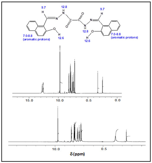 In Figure 4, HAO revealed signals at: 9.7 (CH=N, s), 12.8 (NH, s), 12.6 (naphthoic OH, s), and 7.0–8.8 (aromatic protons, m). Vanishing signals of –OH and –NH upon D2O addition indicated the right positions of these groups. Because deuterium is invisible in the 1H NMR spectrum and the proton in –OH and –NH- groups is labile (acidic proton), doping the NMR sample with D2O easily exchanged out these protons for deuterium, resulting in the disappearance of labile proton peaks.