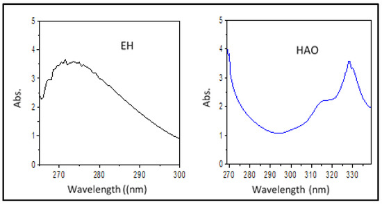 The UV-visible spectra of the EH and its HAO derivative were scanned in DMF and are shown in Figure 5. The electronic data for the studied compounds exhibited one absorption band for EH and five absorption bands for the HAO inhibitor as follows: EH: λmax (nm) equals 375 (n-π*, C=O) and 271 (π -π*, C=O); HO: λmax (nm) equals 330 (n-π*, C=N), 328 (n-π*, C=O), 314 (π-π*, C=N), 300 (π-π*, C=O), and 270 (π-π*, aromatic ring).