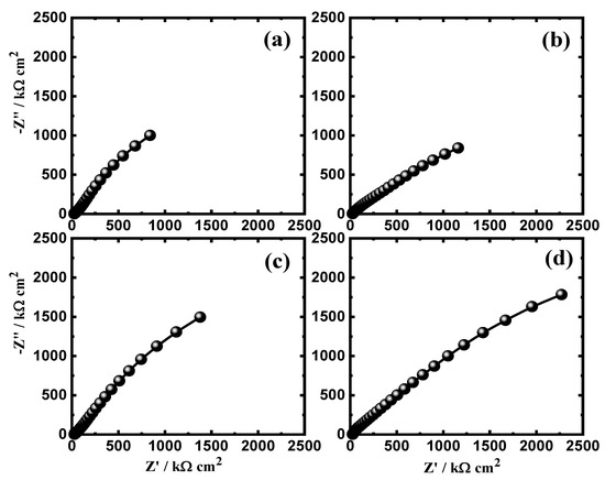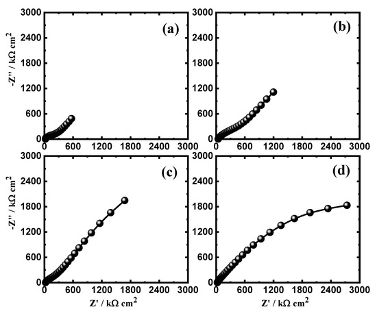 Nyquist plots obtained for iron samples after 1 h immersion in (a) 3.5% NaCl solutions in the absence and presence of (b) 5 × 10−5 M HAO, (c) 1 × 10−4 M HAO, and (d) 5 × 10−4 M HAO.