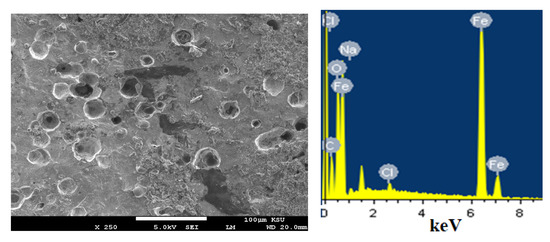 The SEM image and EDX spectra obtained from the surface of iron after its immersion for 48 h in 3.5% NaCl solution (before applying a potential amount of −475 mV (Ag/AgCl) for 60 min) are shown in Figure 13. The SEM micrograph shows numerous pits spreading over the surface of the iron sample. This confirms that the increase in the current with time that is shown in Figure 8 (curve 1) was due to the occurrence of pitting corrosion. The EDX profile analysis indicated that the atomic percentages (at%) for the elements found on the iron samples were 72.54% Fe, 13.53% O, 12.46% C, 0.78% Na, and 0.68% Cl. The at% values for Fe and O were the highest, revealing that the layer formed on the surface during the current–time experiment was mostly iron oxide, as represented by Reactions (6) and (7). The low at% values for both Na and Cl resulted from the deposition of a thin layer of NaCl salt on the surface.
