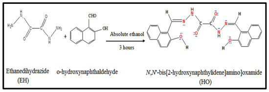 Ethanedihydrazide (EH) and 2-hydroxynaphthalene-1-carbaldehyde were purchased from Sigma-Aldrich (Gillingham, Dorset, UK). HAO powder was dissolved in dimethylformamide (DMF) to prepare a stock solution of 0.01 M. The desired chloride solutions with or without the existence of the tested HAO were synthesized from the stock solutions by dilution. Sodium chloride (99% purity) was purchased from Merck. Other chemicals and solvents were of the highest purity and used without further purification. The elemental analysis (CHN), mass spectrum analysis using the direct inlet system, and FT-IR were carried out as reported [40]. 13C-NMR (at 75.46 MHz) and 1H-NMR (at 300 MHz) measurements in dimethylsulphoxide (DMSO-d6) at room temperature (RT) were performed using a Varian mercury VX-300 NMR spectrometer. The chemical shifts are quoted in δ (ppm) with the aid of an internal reference (tetramethylsilane, TMS). The UV-visible absorptions were scanned on a Shimadzu (UV-1900) spectrophotometer between 200 and 1100 nm. A scanning electron microscope (SEM) with an attached unit for an energy-dispersive X-ray (EDX) analyzer was used to obtain the SEM micrographs and the EDX profiles. The SEM/EDX machine was a JEOL JSM-7400F microscope (Tokyo, Japan). The secondary electron and back-scattered electron detector was an Everhart–Thornley instrument working in automatic mode. The microscopy machine was operated at 15 kV.