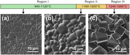 Division of the whole thermal treatment temperature range into three thermal treatment regions, as well as examples of SEM micrographs characterizing each of them: flat microstructure, obtained by thermal treatment at 980 °C—Region I (a); microstructure with well-pronounced relief, obtained by thermal treatment at 1200 °C—Region II (b); cube-like microstructure, obtained by thermal treatment at 1240 °C—Region III (c).