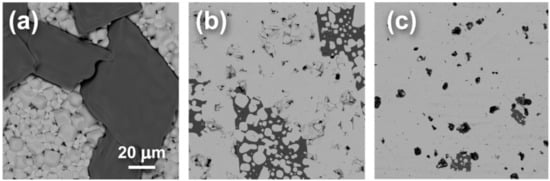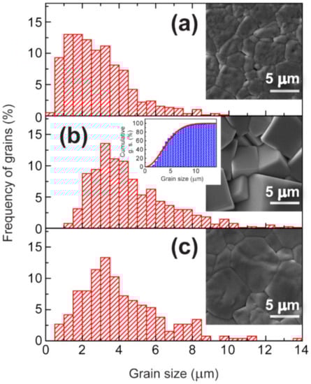 The microstructure of the thermally treated, and thus etched, surfaces of the ceramics were analysed using a scanning electron microscope (Lyra3 SEM-FIB, Tescan, Czech Republic), equipped with an energy-dispersive X-ray (EDX) detector (Aztec EDX system, Oxford Instruments, UK), which was used for chemical composition analysis, and focused ion beam, which was used to prepare a lamella. Grain size distribution and the concentration of inclusions were determined from the obtained SEM micrographs using the ImageJ software (National Institutes of Health, MD, USA) [24]. For a plain (2-dimensional) surface, the size of grains was identified as the average value of size in two perpendicular directions—in the widest and in the narrowest parts of a grain. For 3-dimensional structure, the full-length visible edges of the cube-like grains were measured for the identification of grain sizes, where possible, and the visible parts of the grains were measured in other cases, similar to the 2-dimensional case. (No special corrections were made regarding the fact that the real size of the grains is larger than the size of their projection on the image plane. Therefore, in the presented results, grain size is slightly under-estimated.) Grain sizes were determined for each ceramic sample from at least 3 SEM micrographs, involving 150–300 grains. The concentration of inclusions was calculated by measuring the areas of inclusions and dividing the total area by the total analysed surface area.