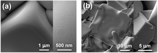 NBT-Eu grains with terrace patterns on rounded edges, observed at thermal treatment temperature of 1240 °C (a) and NBT-Eu grains with sharp edges, observed at thermal treatment temperature of 1280 °C (b).